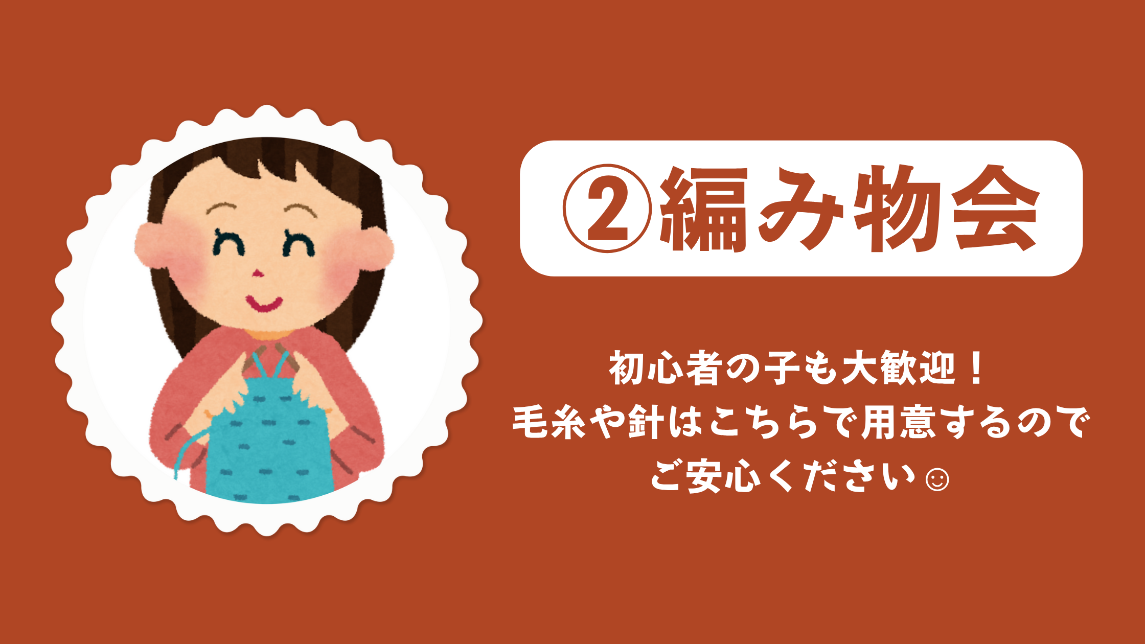 毛糸や針はこちらでご用意しますので、初心者さんも安心してご参加ください♪